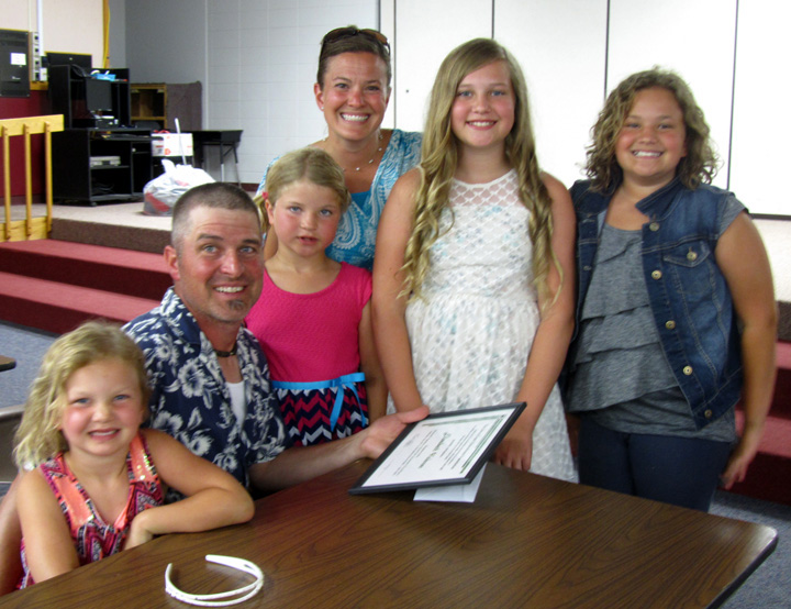 Fred Skaife with the Iowa-Grant Education Foundation presents the grant award to the 4 kindergarten teachers:  (L to R) Molly Leibfried, Sarah Fenstermann, Kristen Nelson, and Heather Mayne.