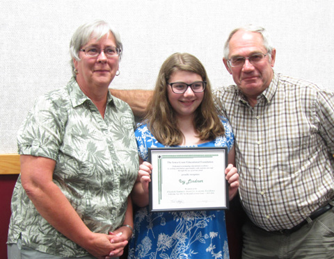 Fred Skaife with the Iowa-Grant Education Foundation presents the grant award to Carrie Hartnett.