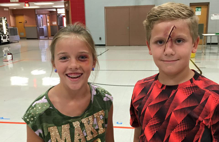 TOP 2 photos - IG teachers, Trisha Sanders & Jennifer Rogstad, helping with Missoula theater & two theater students fresh from the makeup artist.